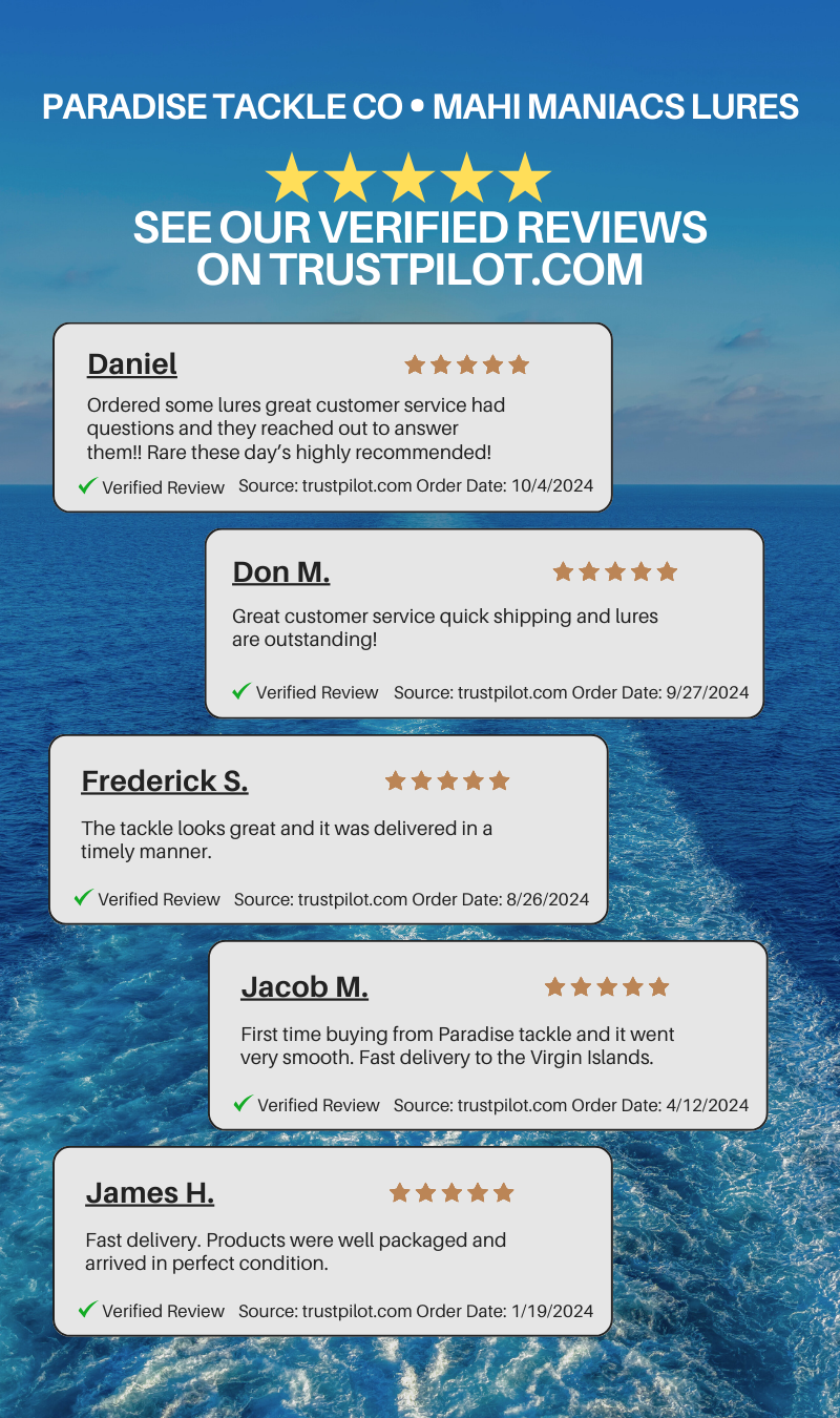 Paradise Tackle Co is excited to announce the acquisition of Mahi Maniacs. Mahi Maniacs lures have earned their place on the decks of fishing boats worldwide. Renowned for their unmatched effectiveness, durability, and quality, they outperform all other lures on the market. If you haven't tried them yet, now is the time to experience the difference and see why seasoned anglers swear by Mahi Maniacs. Get the ultimate edge on the water by adding Mahi Maniacs lures to your tackle bag today! Plus, join our vibrant Facebook community of over 35,000 members in our "Mahi Maniacs" group and connect with fellow enthusiasts who trust and love our products.