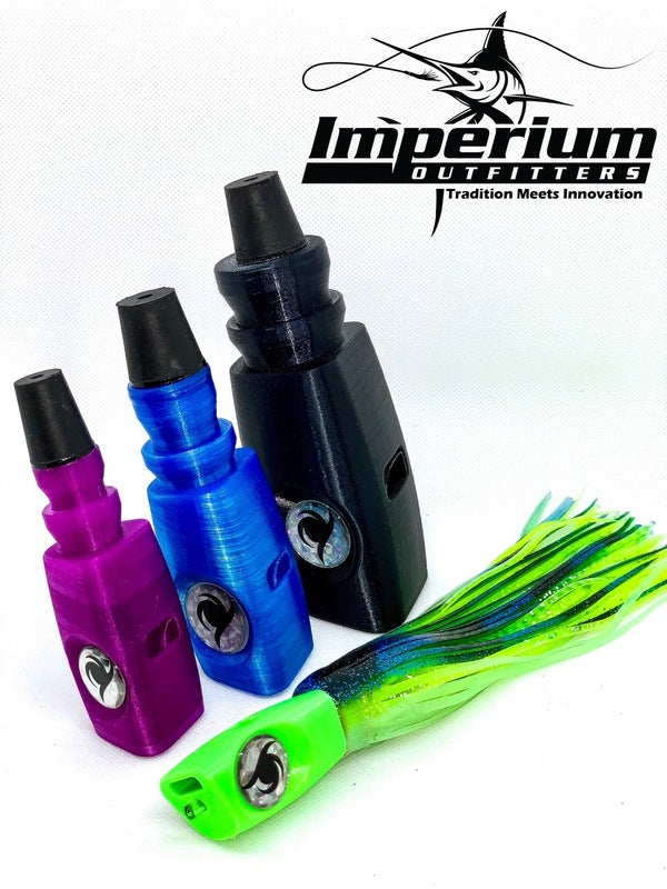 The Beluga is Imperium’s flagship lure. This design drew inspiration from a desire to update the classic plunger shape. There is a 5-6 second cycle before it pops and dives again. Where it differs from a classic plunger starts at re-entry on the cycle. It enters the water at a much steeper angle than a classic plunger due to the large single jet on top face of the lure. When it dives, there is a phenomenal bubble trail from the single jet. When it pops out, both the face and and jet throw water like a bait fish jumping out. This lure can be fished in a variety of sea conditions from flat to rough waters. One of a kind design with multiple species application.