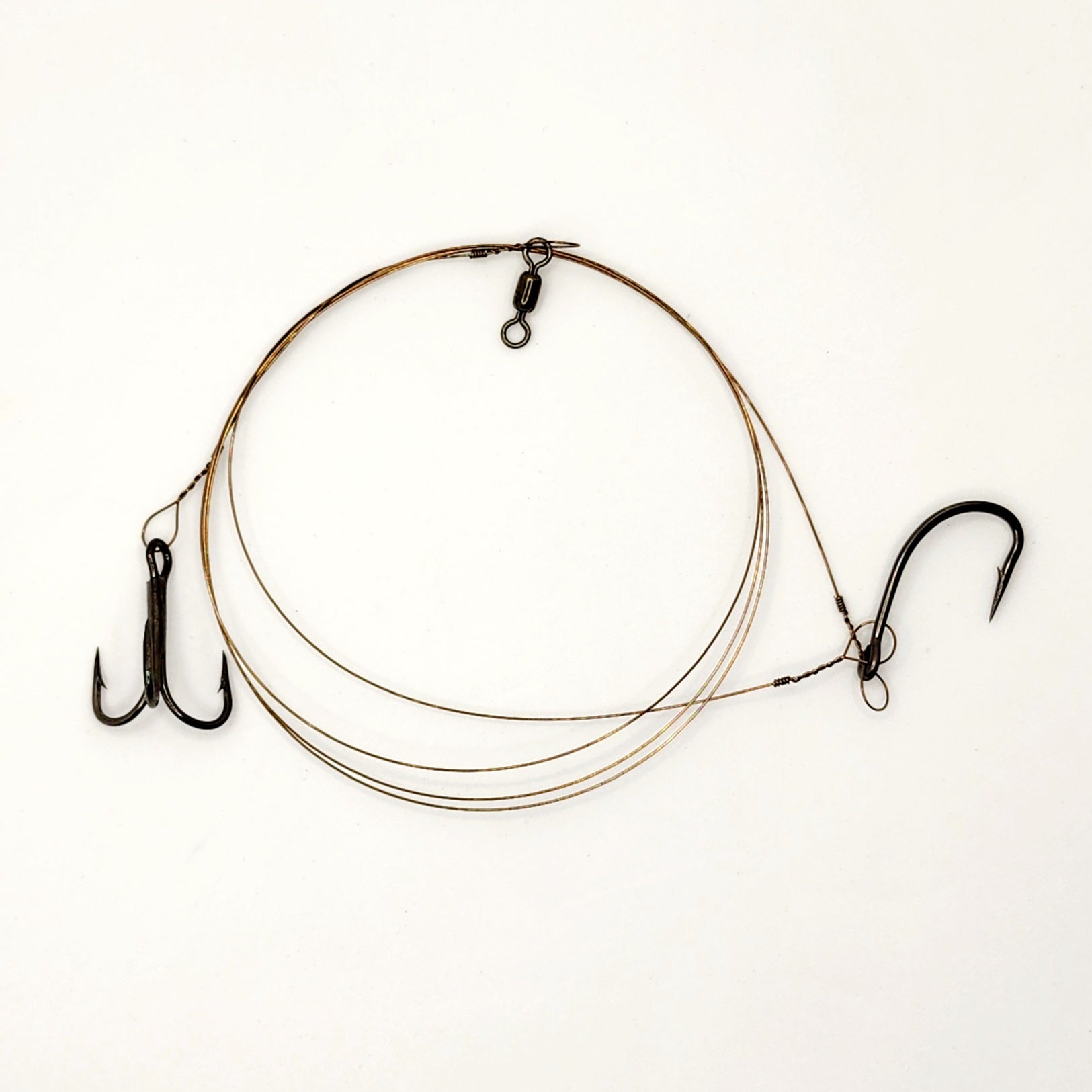 Paradise Tackle Kingfish Rigs are hand made in house and highly effective at catching Kingfish, Wahoo, Mahi and other offshore pelagic fish. Just tie it onto your leader with the swivel! These rigs are made using #5 Camo 44lb AFW Single Strand Wire, AFW 133lb Mighty Mini Swivel, and Mustad Hooks! Excellent for trolling live or dead bait between 2-5kts.