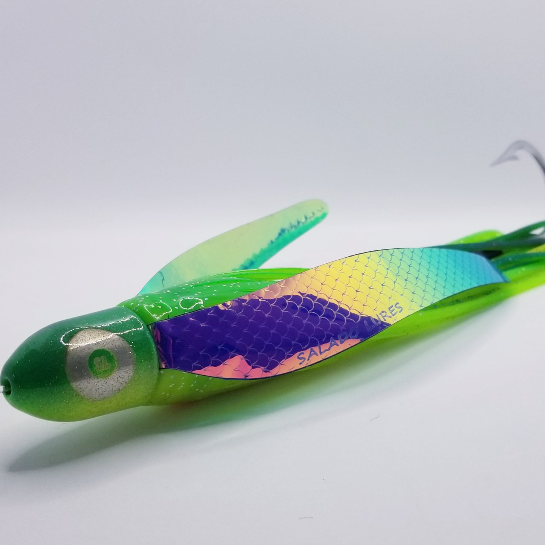 This high speed bullet lure is machined from solid 6061 aluminum stock and coated with an extremely durable powder coat. 11" lure length.