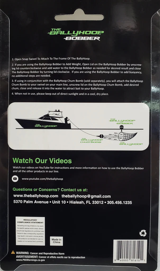 The BallyHoop Bobber works in conjunction with your BallyHoop to either add buoyancy or add weight to the BallyHoop. This will help keep your BallyHoop afloat in a situation where there is no current and if you are looking to target bait fish that are lower in the water table, you would add water to the Bobber and it will act to sink the BallyHoop to go and get those bait that are below the surface.