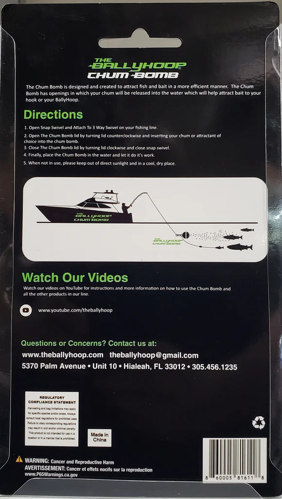 The Chum Bomb is designed and created to attract fish and bait in a more efficient manner. The Chum Bomb has openings in which your chum will be released into the water which will help attract bait to your hook or your BallyHoop!