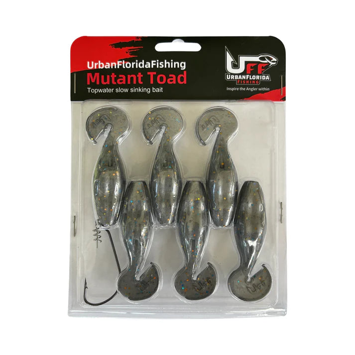 The Mutant Toad and Big Eye Mutant Toad are extraordinary fishing lures that combines the best of a Plopper, a frog, and a mouse. Specifically crafted to catch Snakehead and Bass this topwater, slow-sinking bait offers an exhilarating fishing experience but its appeal doesn't stop there – the Mutant Toad also attracts a variety of other species. You never know what you'll hook into with this lure! Catch fish anywhere there are frogs, toads, or mice which is virtually EVERYWHERE! With its curly tail that generates an irresistible plopper action and sound, this versatile mutated lure can be skipped under brush, trees, docs, into pipes and is a must-have for every angler's arsenal. It comes in a pack of 6 and includes a size 2/0 cyclone hook. Get ready to elevate your fishing game and embark on unforgettable adventures with the UFF Mutant Toad! The toad is best to pair with a high gear ratio baitcaster reel (7.2:1 or higher). The toad also works great with a spin rods and a gear ratio of 6.3:1 is a great start for spin combos!